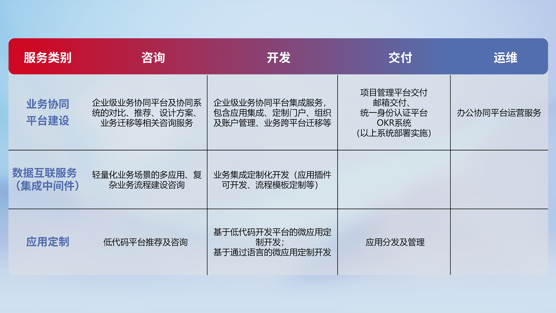 针对钉钉、、、、企微、、IDaas等平台级产品提供产品的规划、、方案、、交付、、定制化开发等服务,,,,实现如统一协同办公、、智能客户服务、、混合会议管理、、、智能数据查询、、、、等业务场景,,,,实现数字化转型。。。